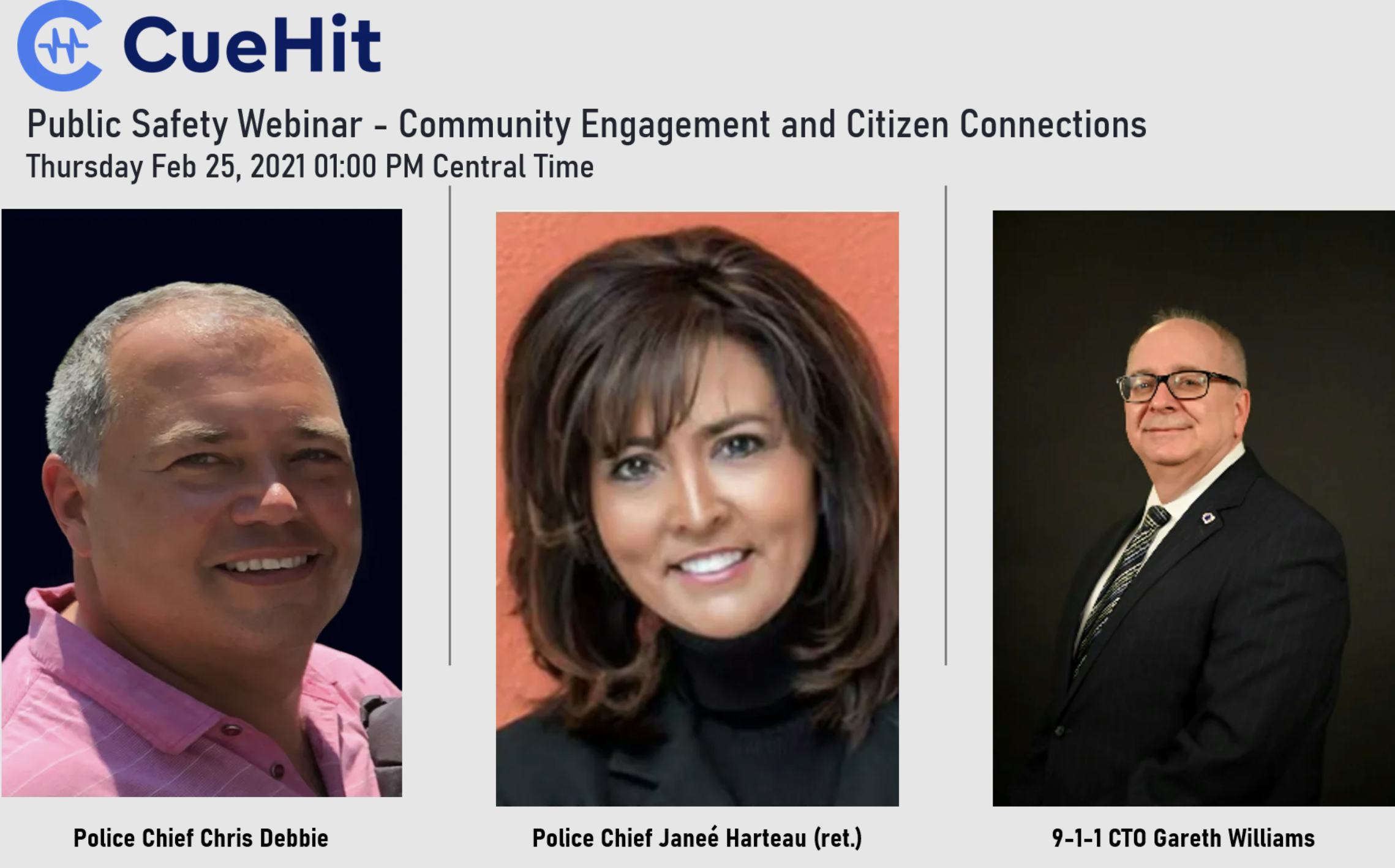 CueHit Co-Founder, Scott MacDonald joins current and former Chiefs of Police and 9-1-1 Directors as they discuss new technologies that help Law Enforcement, Fire/EMS, and Emergency Communications Centers engage the community, measure and improve citizen satisfaction and help employee morale - all with the CueHit Connection Platform for Public Safety.